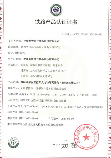 304永利集团公司喜获电动隔离开关CRCC认证证书