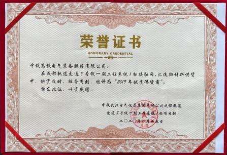 公司被中铁武汉电气化局成都轨道交通9号线一期系统1标项目部评为“2019年优质供货商”