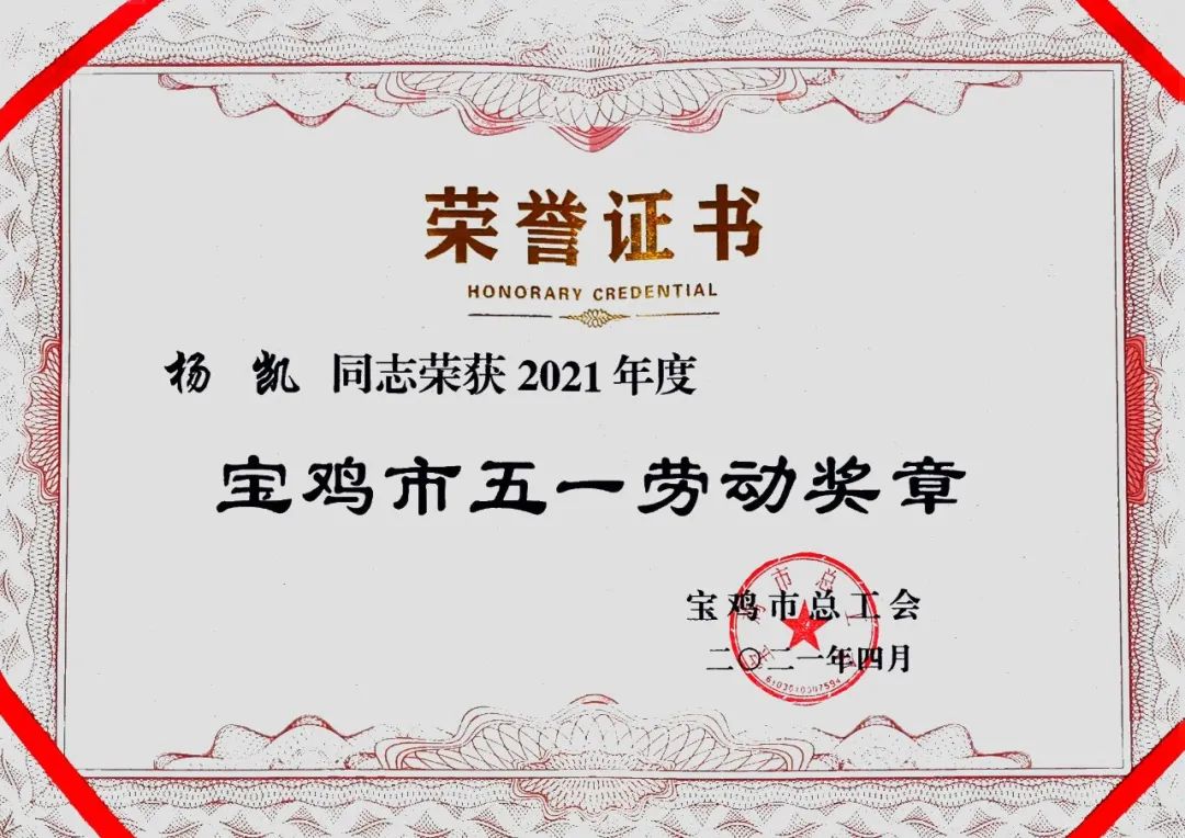 4月28日,宝鸡市庆祝“五一”国际劳动节大会在行政中心召开。会上,命名并表彰了一批“最美劳动者”,城铁市场开发部杨凯获五一劳动奖章。