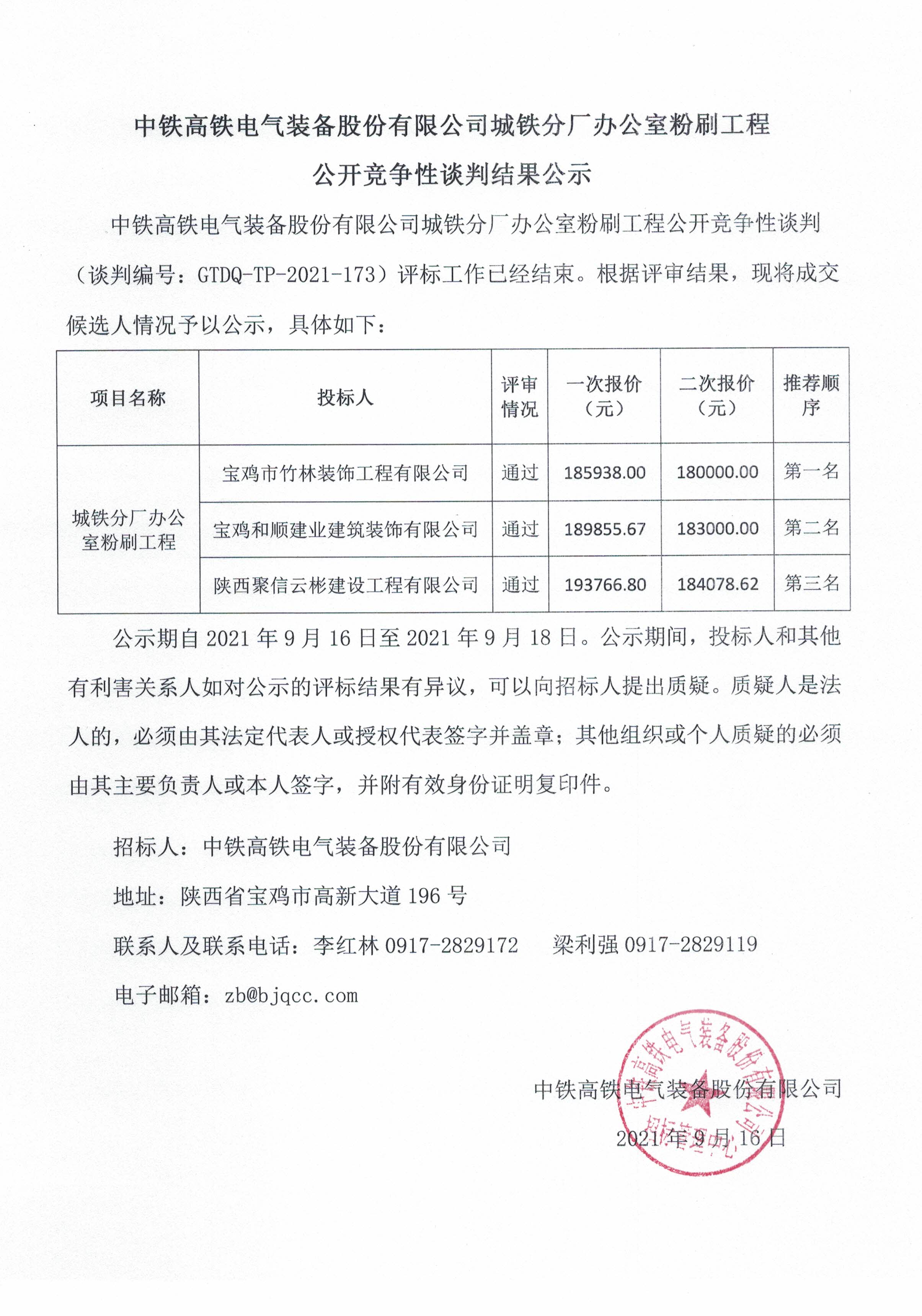 GTDQ-TP-2021-173304永利集团公司城铁分厂办公室粉刷工程公开竞争性谈判结果公示