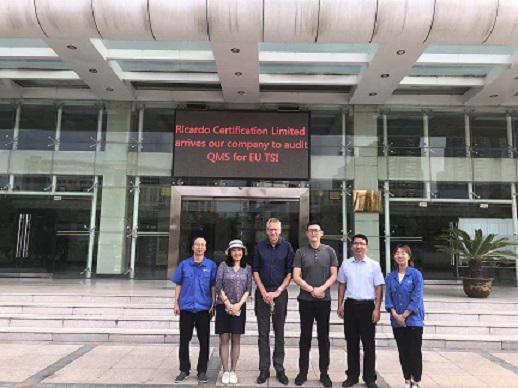 2019年9月5日上午,里卡多认证公司一行三人莅临公司进行欧盟TSI标准QMS审核认证工作,公司总经理张厂育、副总经理陈永瑞、副总经理李忠齐、总工程师林建和董事会秘书王舒平,对来访外宾进行了欢迎。