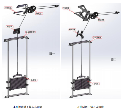 隧内棘轮下锚补偿装置由: 棘轮补偿装置、 隧内棘轮下锚底座、 转向滑轮、 隧内坠砣限制架、坠砣框架组成。 非开挖与开挖底座需根据现场实际情况确定。